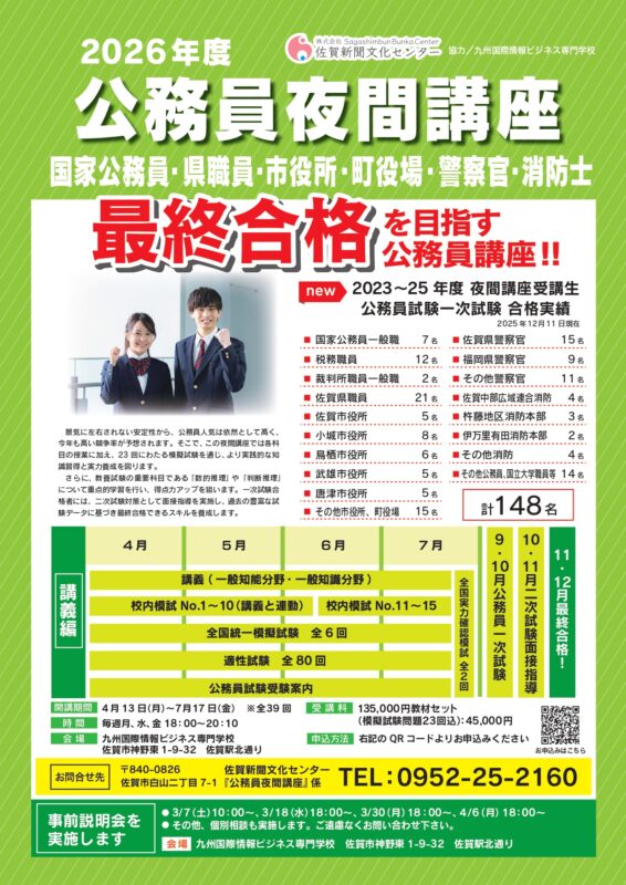 「佐賀新聞文化センター」と「九州国際情報ビジネス専門学校」は、公務員を目指す、高校生、大学生、社会人等を対象として、公務員夜間講座を開催します。