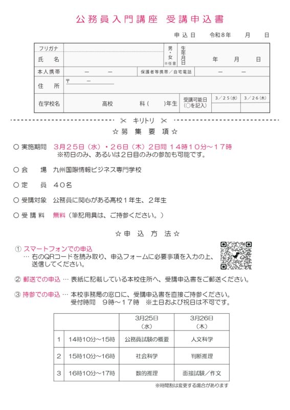 お申込みは、ページ下記の公務員講座申込みのバナーをクリックの上、必要事項を入力ください。または、スマートフォンにてページ下記の申込みQRコードを読み取りの上、必要事項を入力ください。